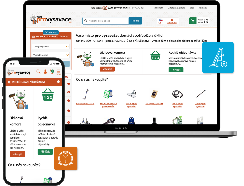 Ne každý si pamatuje typ svého vysavače. Najít správný sáček pak může být docela výzva. Proto má uživatel na e-shopu Provysavace.cz možnost uložit hned několik typů vysavačů do tzv. úklidové komory. Přes ni se jednoduše dostane k veškerému příslušenství přímo na svůj konkrétní typ vysavače.