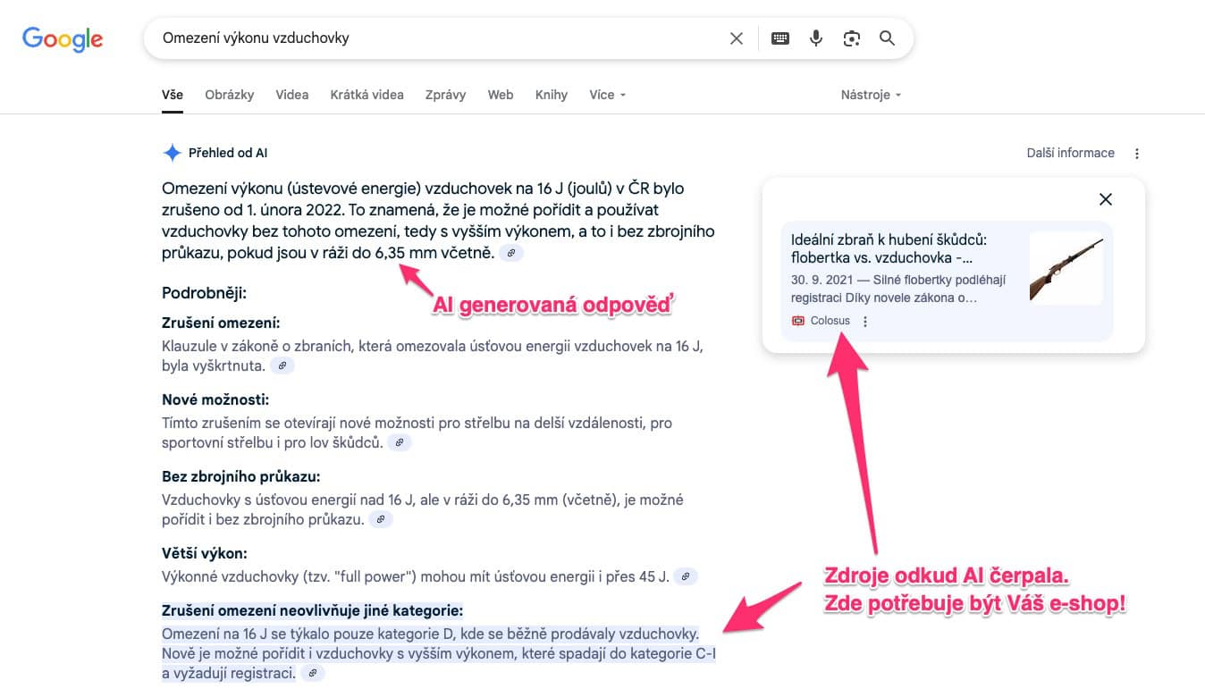 Pro e-shopy to znamená zásadní změnu: místo toho, aby uživatel kliknul na váš odkaz v organických výsledcích, může získat odpověď přímo od AI, která může citovat váš obsah, ale také konkurenční informace.