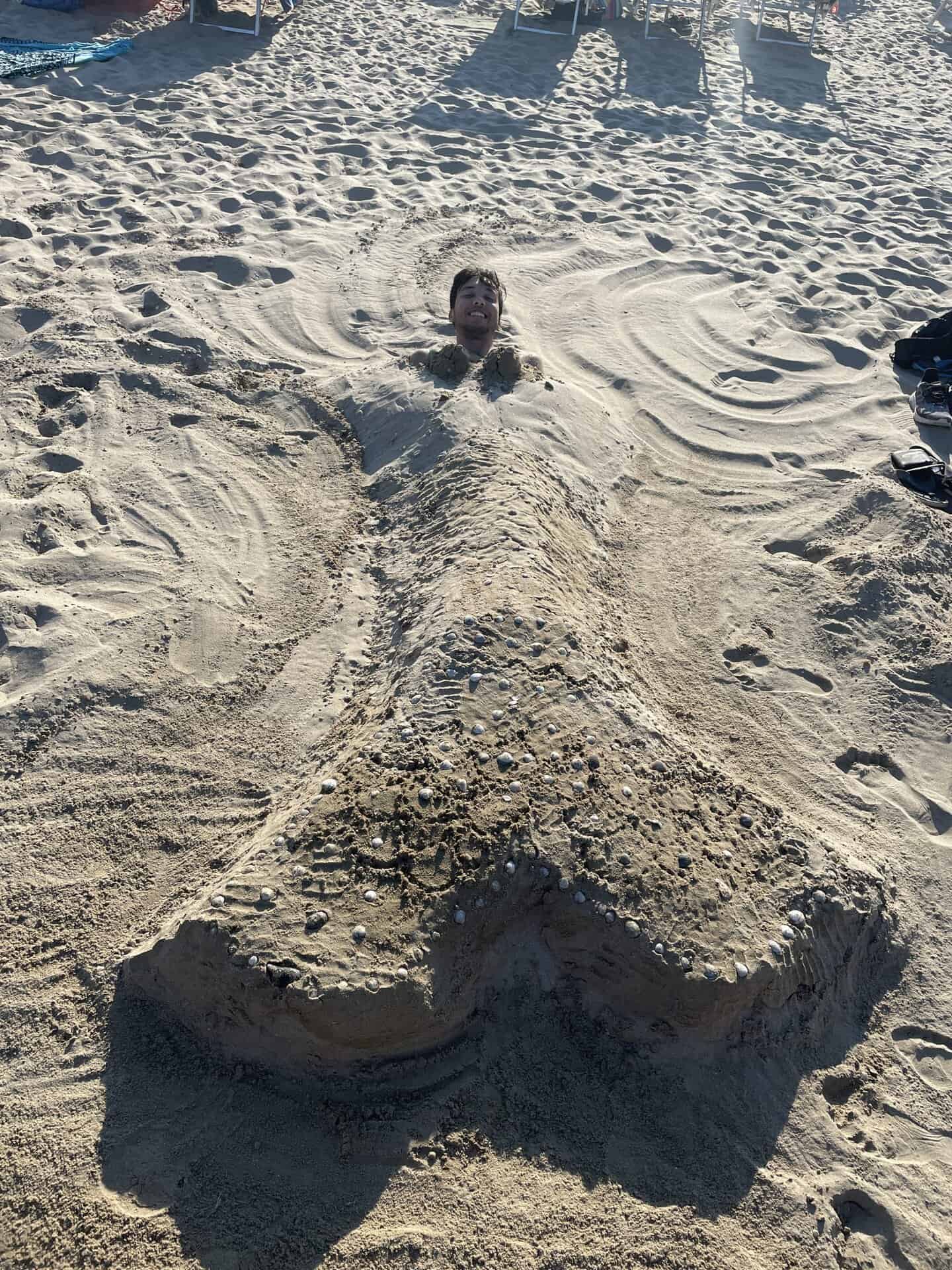 Kromě sportu, jídla, pití a řádění v moři jsme se vyřádili také na písečných plážích a vypustili našeho kreativního ducha 😀 Zanechali jsme Italům malou vizitku 3IT a z Luboše jsme na chvíli udělali mořskou pannu ?♂️ 😀