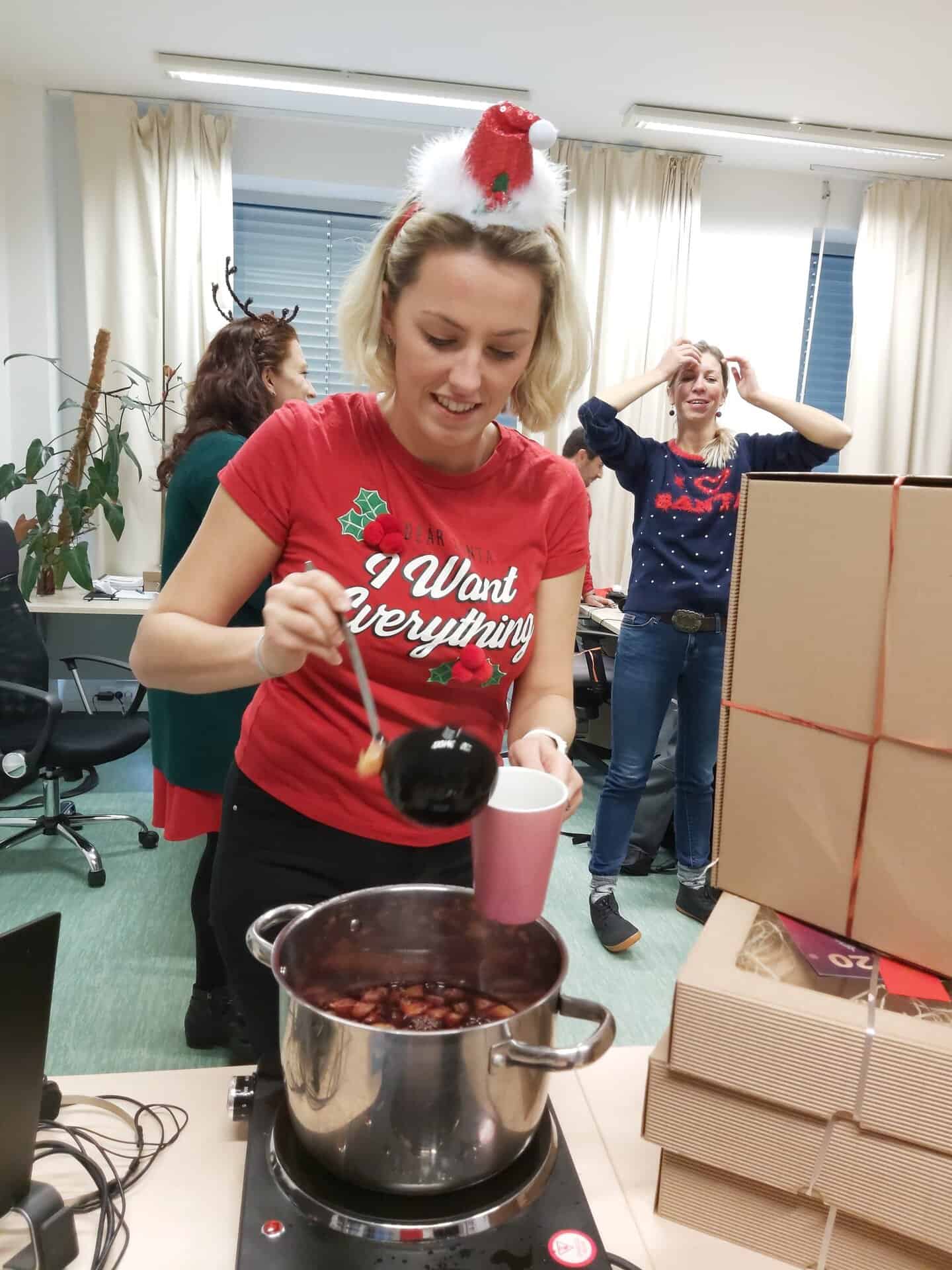 V kanceláři jsme si uvařili skvělé svařené víno, pustili koledy a jakmile zazvonil Ježíšek, objevily se pod stromečkem dárky. A jak to u nás chodí? My máme tajného Ježíška. Každý člen týmu si náhodně vylosuje kolegu a pro toho koupí menší dáreček.